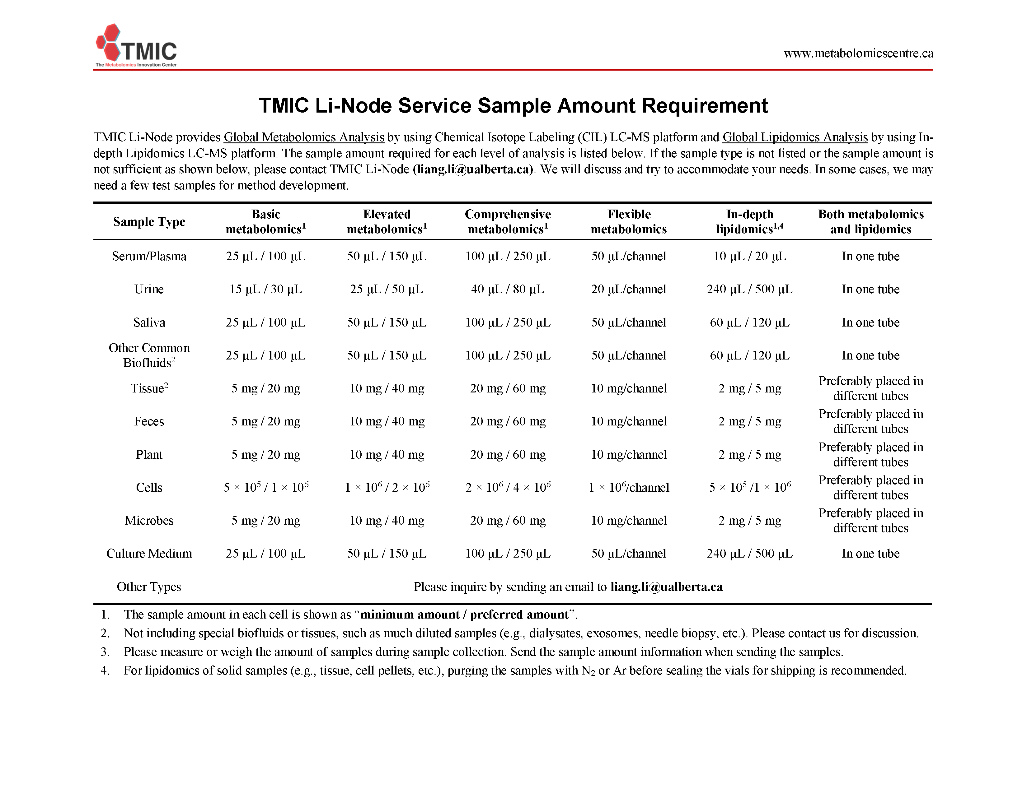 The sample amount required for each level of analysis is listed below. If the sample type is not listed or the sample amount is not sufficient as shown below, please contact TMIC Li-Node (liang.li@ualberta.ca). We will discuss and try to accommodate your needs. In some cases, we may need a few test samples for method development.